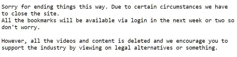 Message saying : Sorry for ending things this way. Due to certain circumstances we have to close the site. All the bookmarks will be available via login in the next week or two so don't worry.